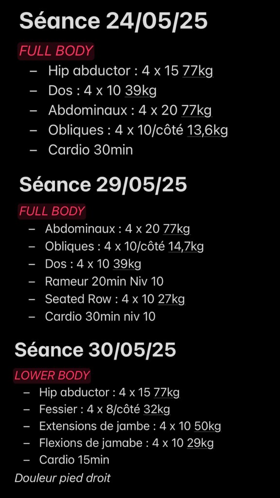Pour ĂȘtre sĂ»re d’atteindre mon objectif cette annĂ©e j’ai dĂ©cidĂ© de faire 30min de cardio Ă CHAQUE sĂ©ance. Je fais Ă©galement de la musculation au moins 2 fois par semaine et je track toutes mes sĂ©ances dans mon bloc-notes âŹïž